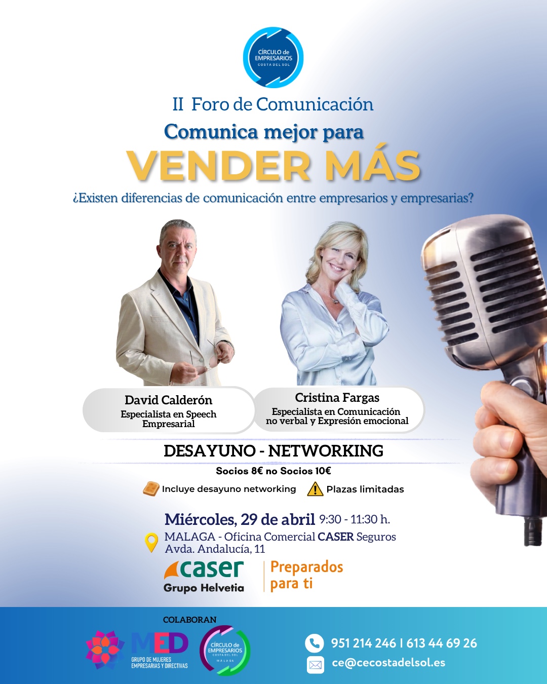Te invitamos al II Foro de Comunicación organizado por el Círculo de Empresarios de Málaga y la Plataforma de Mujeres Empresarias y Directivas del Círculo de Empresarios Costa del Sol. Una jornada diseñada para que aprendas a vender más comunicando mejor.